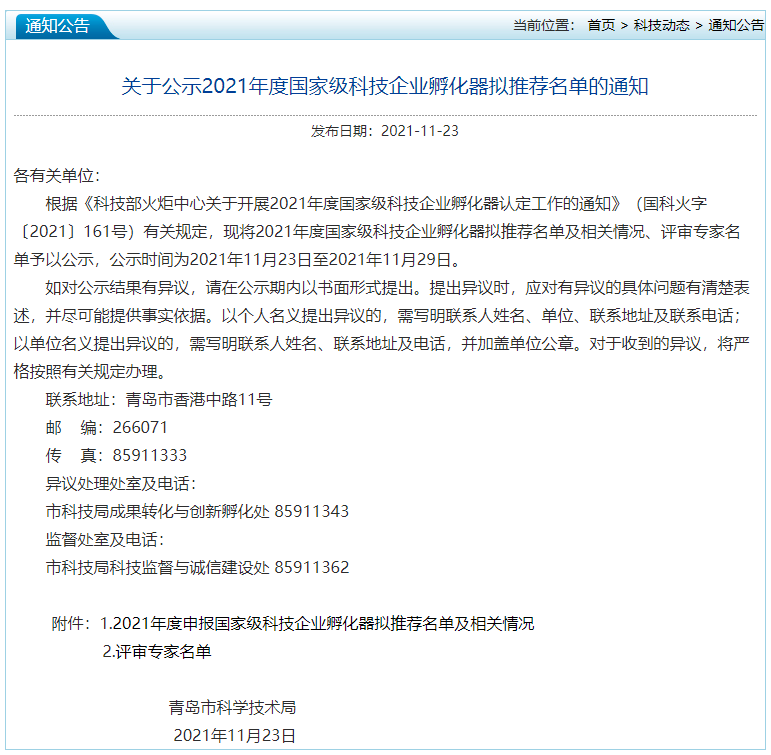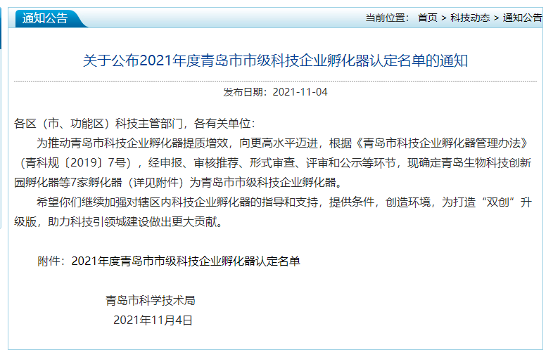 一、唯一入选青岛市“国家级科技企业孵化器”拟推荐名单,荣获“青岛市科技企业孵化器”称号