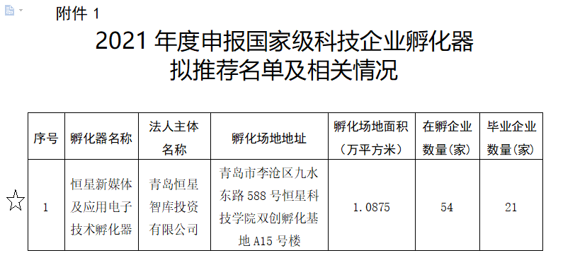 根据《科技部火炬中心关于开展2021年度国家级科技企业孵化器认定工作的通知》(国科火字[2021]161号)有关规定,2021年11月23日,青岛市科技局发布了《关于公示2021年度国家级科技企业孵化器拟推荐名单的通知》,恒星新媒体及应用电子技术孵化器成为青岛市唯一入选机构。